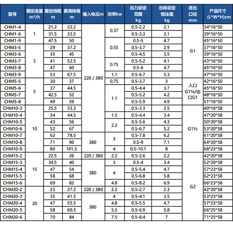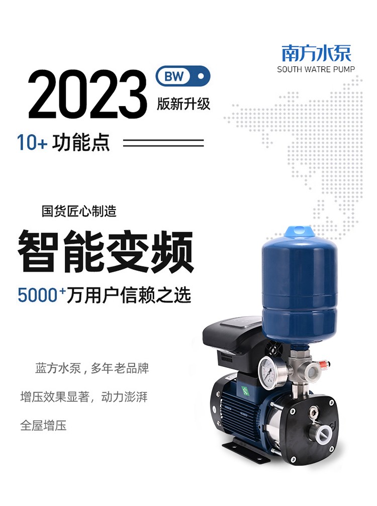 南方CHME系列臥式智能恒壓變頻泵采用了變頻調速及自動化控制相結合的技術,配合高效節能的CHM非自吸輕型臥式多級離心泵。整機主要由CHM泵、控制器、傳感器、壓力罐、五通止回閥及軸向抗震壓力表等組成。具有性能穩定、高效節能、全自動智能控制、低噪音、耐腐蝕、結構緊湊、外形美觀、體積小、重量輕等特點。